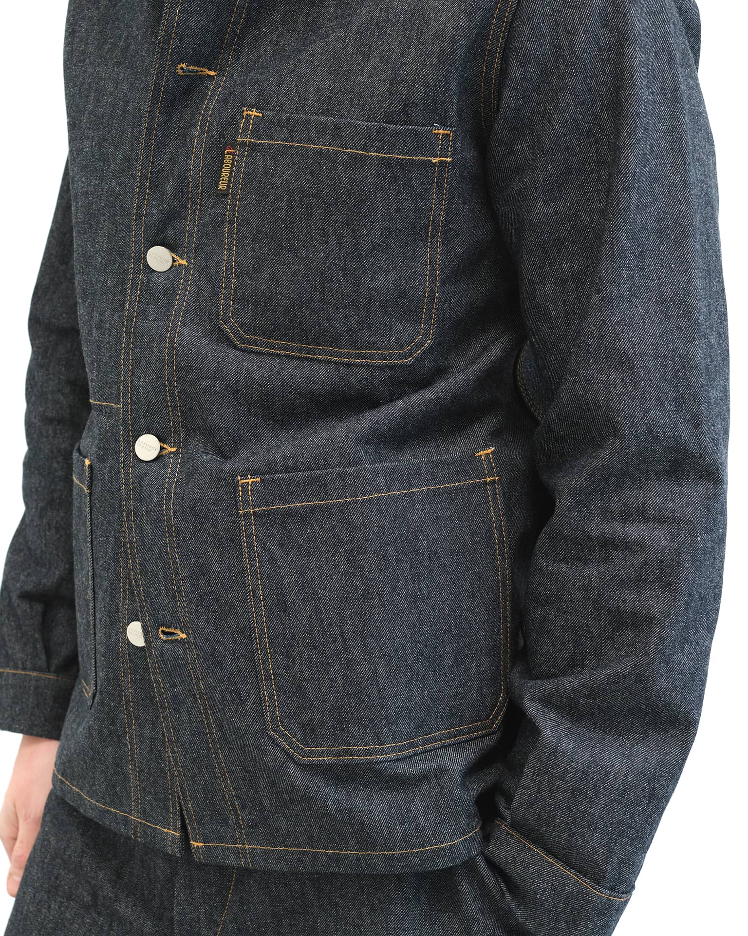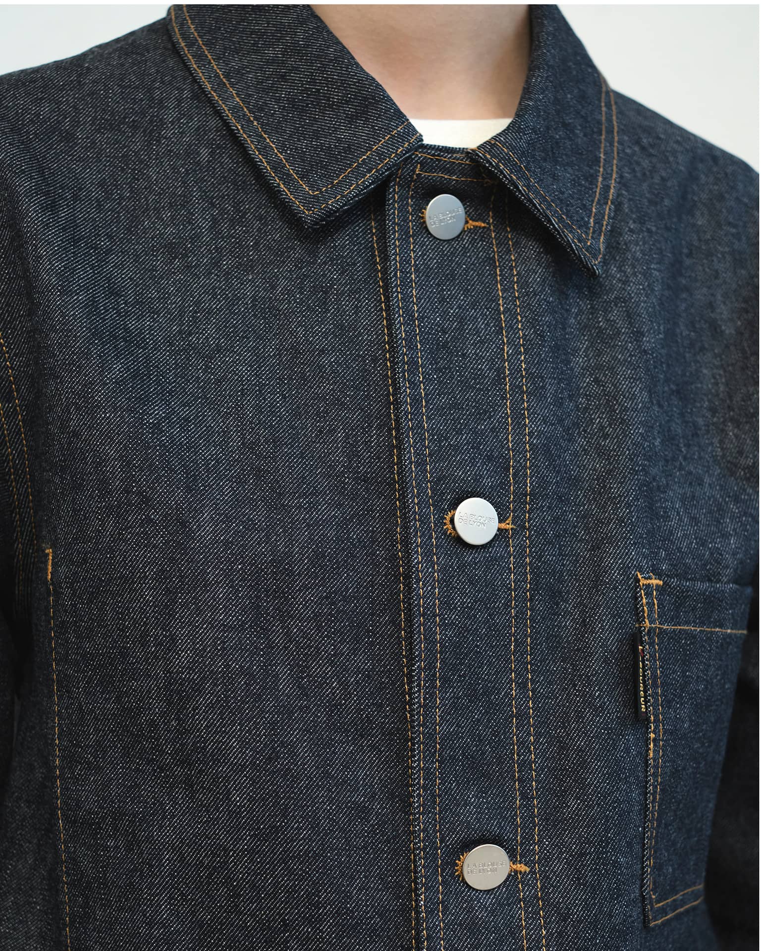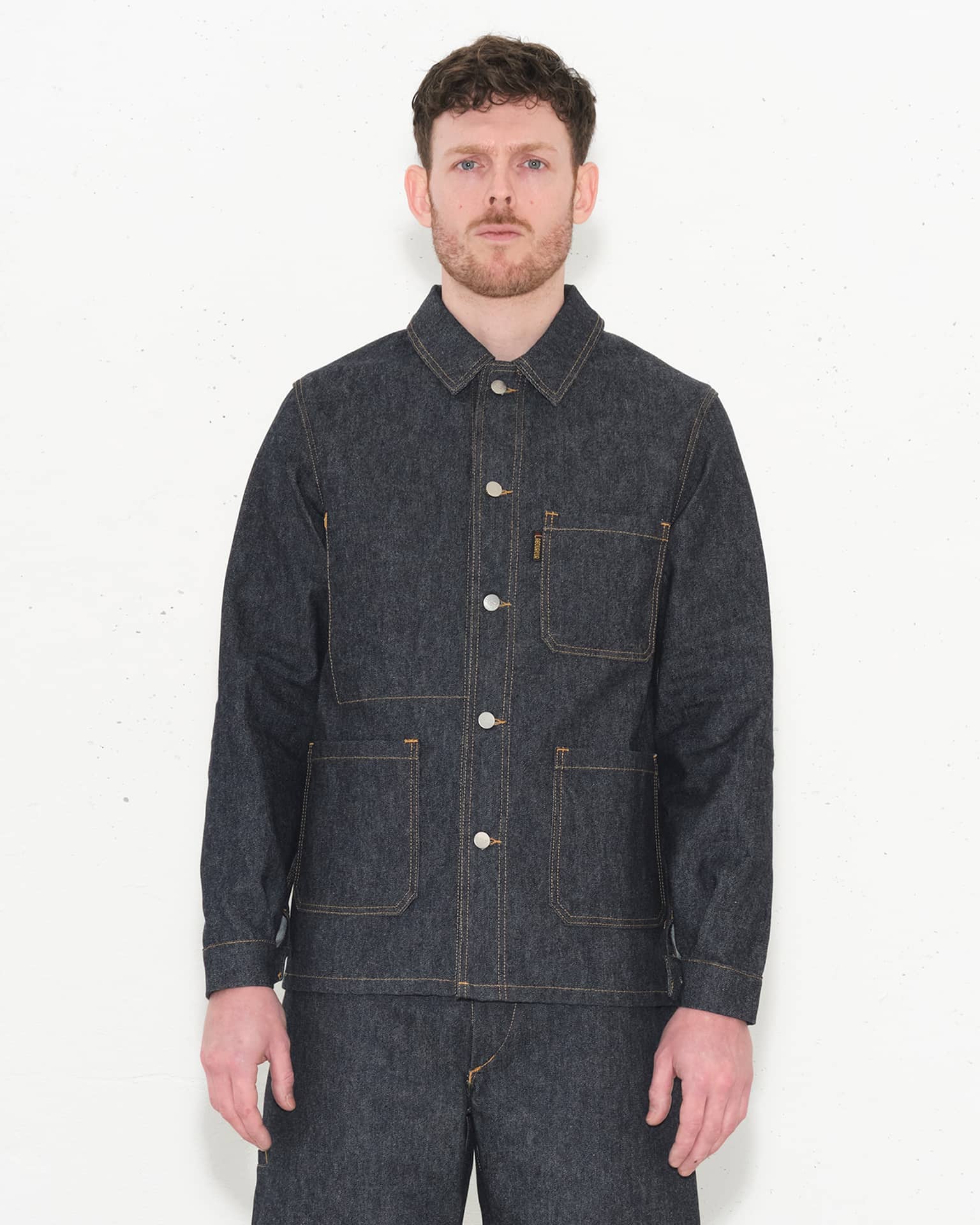La veste de travail traditionnelle qui a équipé des générations d’ouvriers. Rien ne change dans la coupe, rien ne change dans le montage. Nous appliquons simplement la rigueur du travail du coton sur ce denim brut, avec des boutons en métal brossé pour la solidité et la sobriété.