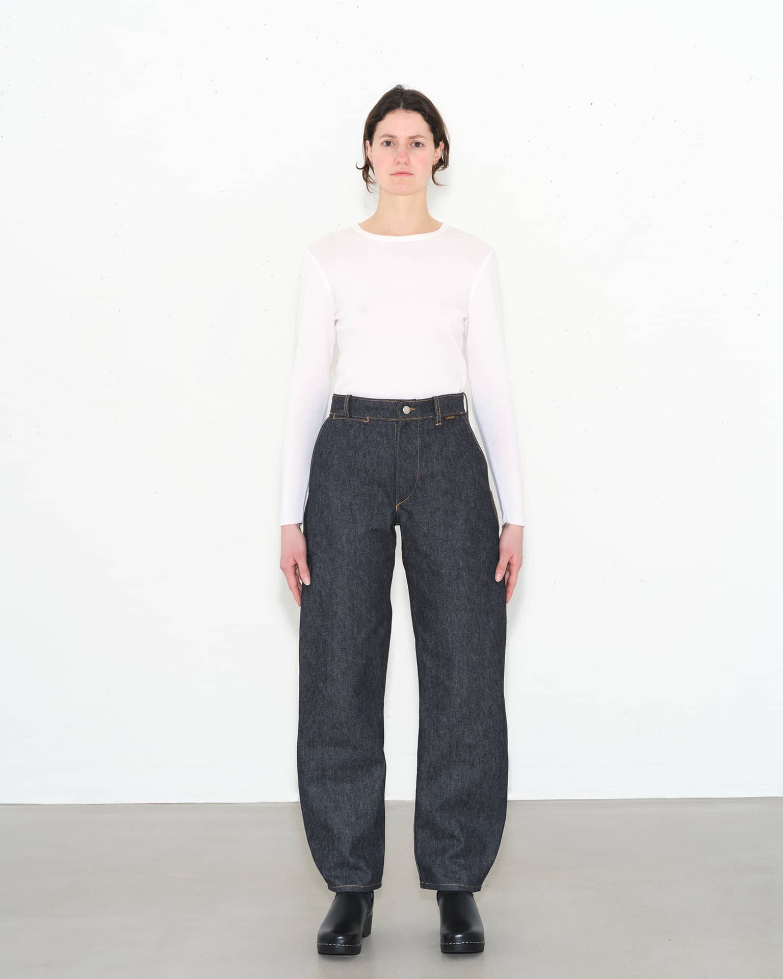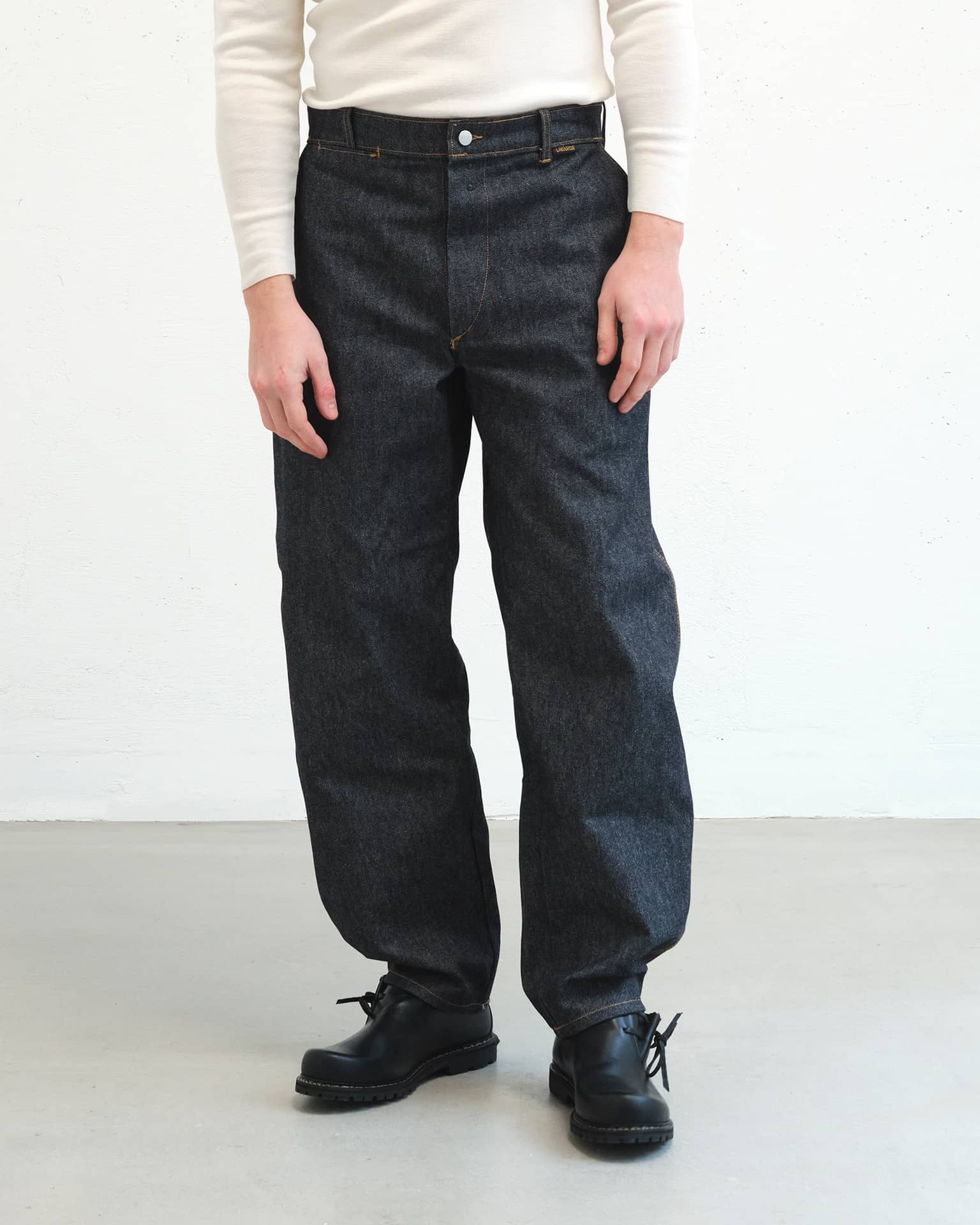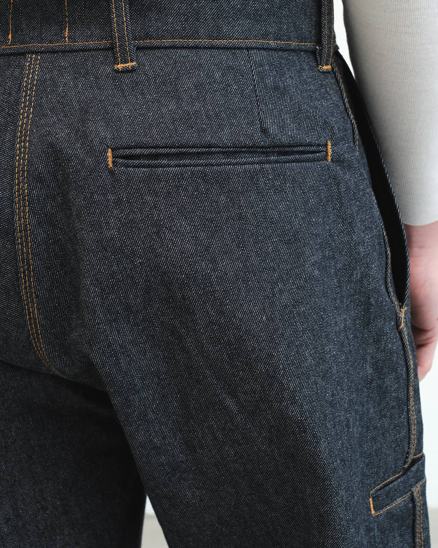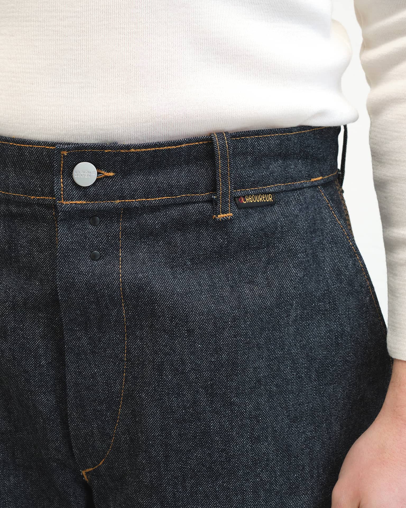 Nous avons sélectionné un denim brut de 400 grammes. C’est une toile dense, 100% coton organique, qui demande à être portée pour s’assouplir.
